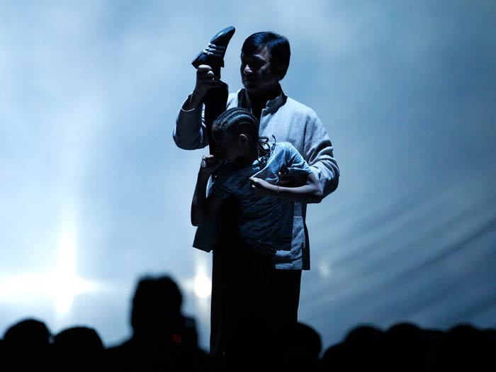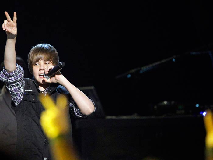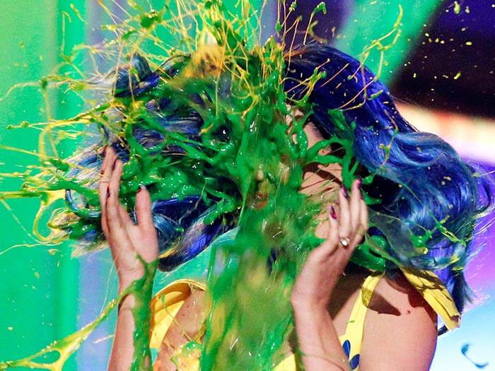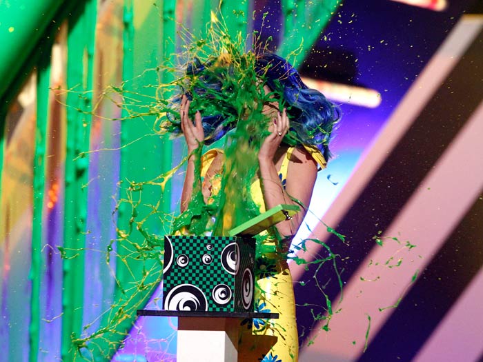 A atriz Miley Cyrus foi eleita a melhor atriz de cinema e desbancou até Sandra Bullock, que levou o Oscar deste ano. O jovem cantor Justin Bieber comanda a plateia durante o evento em Los Angeles (EUA). A atriz Selena Gomez mostra o troféu que ganhou como a melhor atriz de TV. A atriz Rosario Dawson e o atleta olímpico americano Shaun White anunciam o ganhador do prêmio de melhor ator: Taylor Lautner. O patinador americano Apolo Anton Ohno (esq.) brinca com a forma física do ator e apresentador Kevin James no palco. O ator Jonah Hill e a cantora Katy Perry entram no palco limpos. Na sequência, porém, ela se deu mal... Katy Perry abre uma das caixas e recebe um banho de tinta verde. Detalhe do líquido no rosto da cantora. No final, porém, ela mostrou espírito esportivo e foi abraçar o ator. Os atores Jackie Chan e Jaden Smith fazer uma performance durante premiação do Kids' Choice Awards. Rihanna apareceu em cima de um tanque cor de rosa durante sua apresentação na premiação em Los Angeles. A cantora Rihanna se apresenta entre homens fantasiados de robôs.